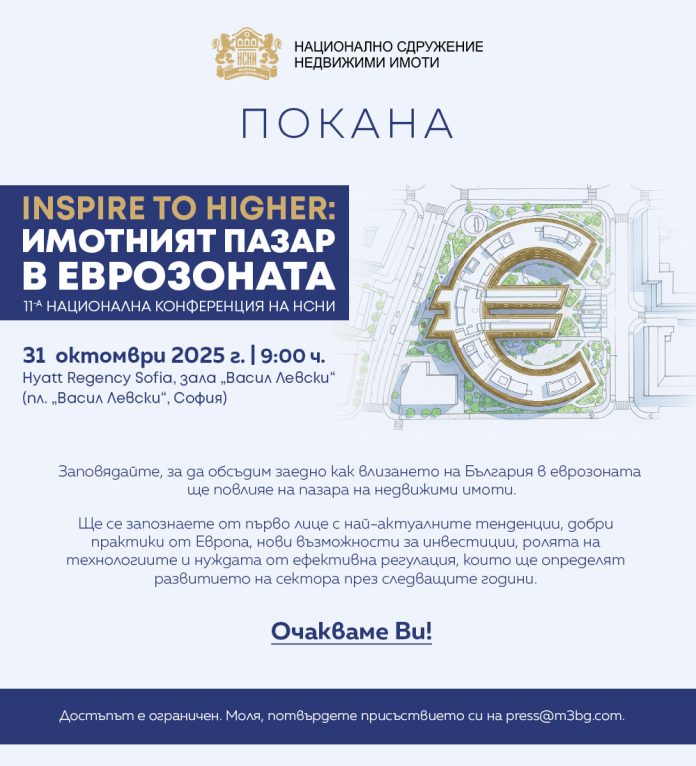 Национална конференция „Inspire to higher 2025: Имотният пазар в еврозоната“ ще се проведе на 31 октомври 2025 г. в София. Експерти ще очертаят ключовите ефекти от присъединяването на България към еврозоната върху пазара на недвижими имоти – възможности за растеж, регулаторни и пазарни предизвикателства, управление на риска и финансиране в преходния период.