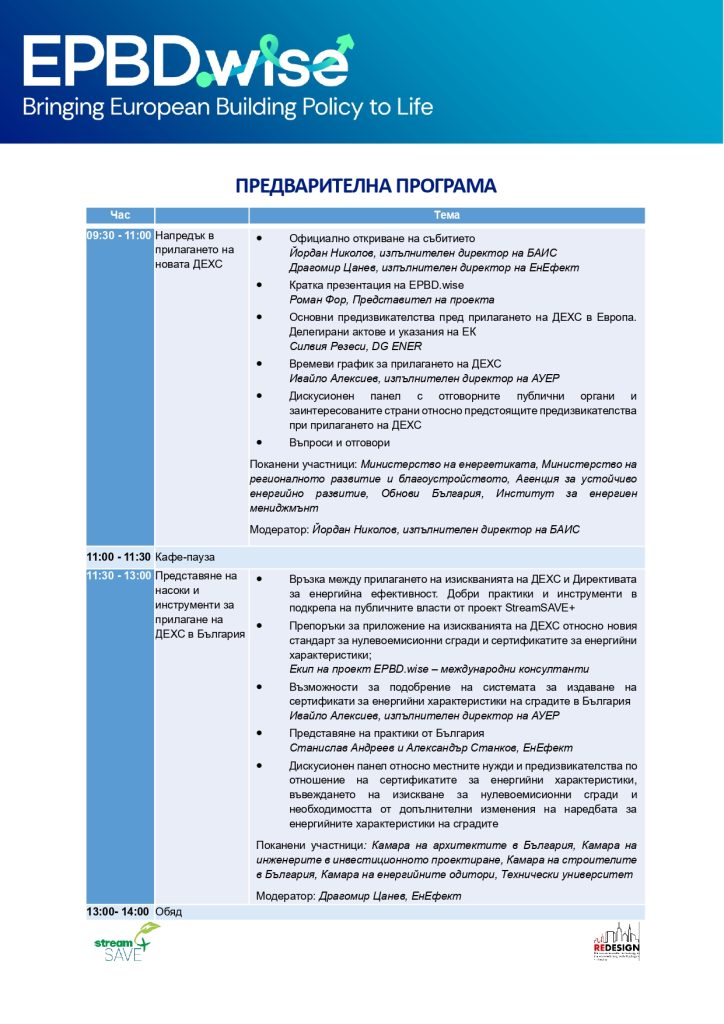В рамките на събитието ще се проведат дискусионни панели с участие на представители на Министерство на енергетиката, МРРБ, АУЕР, както и представители на университети и професионални организации.